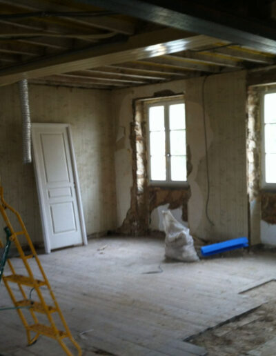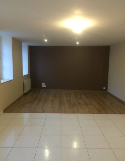 Cette rénovation a nécessité une refonte totale des volumes. L’appartement, autrefois sombre et vétuste, a été entièrement repensé pour créer un espace de vie sain, intégrant deux nouvelles chambres et une salle de bain moderne. Le local commercial au rez-de-chaussée a également bénéficié d’une remise aux normes complète pour accueillir une nouvelle activité professionnelle. De la ruine intérieure est né un ensemble immobilier pérenne et sécurisé.